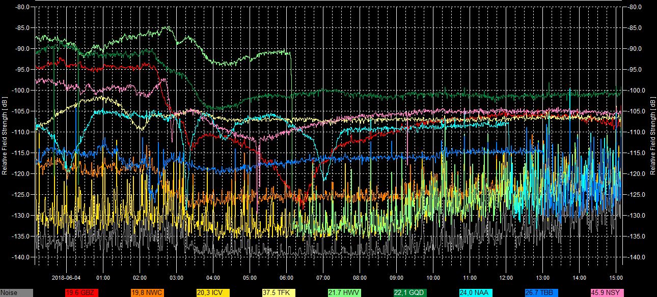 directly into the audio input of a soundcard. On top of the first graph you find the Fourier spectrum showing the signal strength as a function of time in two colours. The black line shows the actual Fourier result while the red line shows the average result over the last 5 minutes. The lower part of the top graph shows the same actual spectrum but now as a function of time. Different colours in this waterfall display represent the signal strength. In the second graph you find the signal strengths of a number of stations on discrete frequencies as a function of time. The contents of this second graph slowly moves to the left. In total you can see the signal strength over a period of 12 hours. In this second graph it is possible to recognise a number of physical phenomena. First of all you see the influence of the Sun on the propagation at sunrise and sunset in the direction of the transmitter. The signal strength is very different if you compare the signals during daytime and nighttime. At daytime the signals are usually rather constant compared to nighttime. At daytime the signals are refracted by the D-layer. The influence of the Sun is zero at night over the path towards the transmitter. The signals are then refracted by the E-layer. At daytime there may be some sudden variations on the signals. If you see a temporary variation on multiple transmitters' signals at the same time it may be the result of a solar flare influencing the propagation path between transmitter and receiver. This is called a Sudden Ionospheric Disturbance (SID). The occurence of solar flares can be monitored in real time on this SWPC web page. Any X-ray event during daytime of at least C2 level may produce a SID registration on our graphs. An overview of the VLF stations that may be received at our station PI5RTA at ROC Ter AA in Helmond can be found on the VLF stations list page. |
